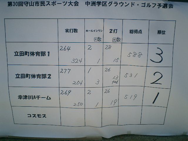 9月11日 中洲学区スポーツ大会学区予選(グランドゴルフ)が終了しました。 残暑厳しいの中、協会の方、選手の皆さん お疲れ様でした。 幸津川Aチームが昨年に続き優勝されました。 本大会も頑張ってください。