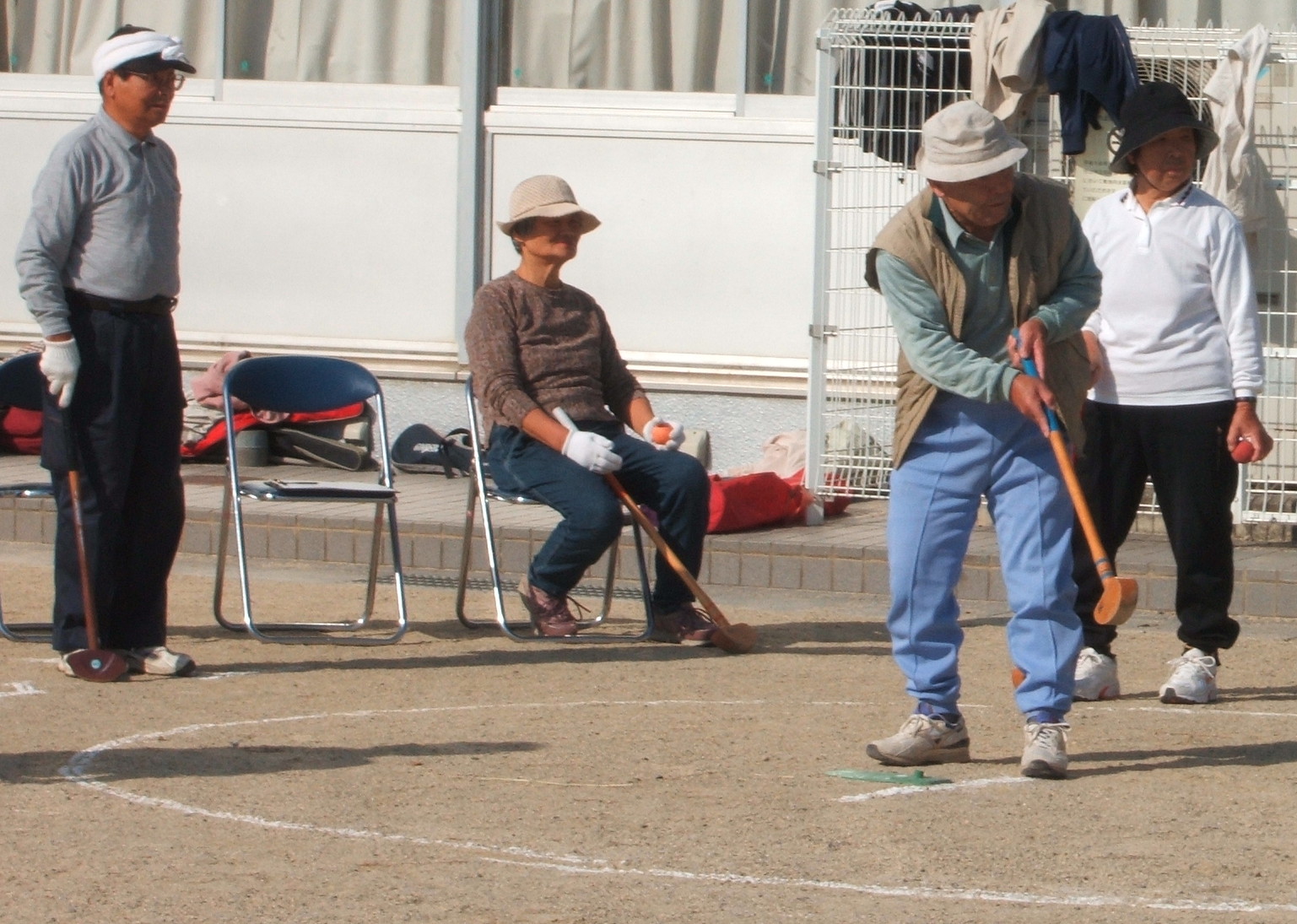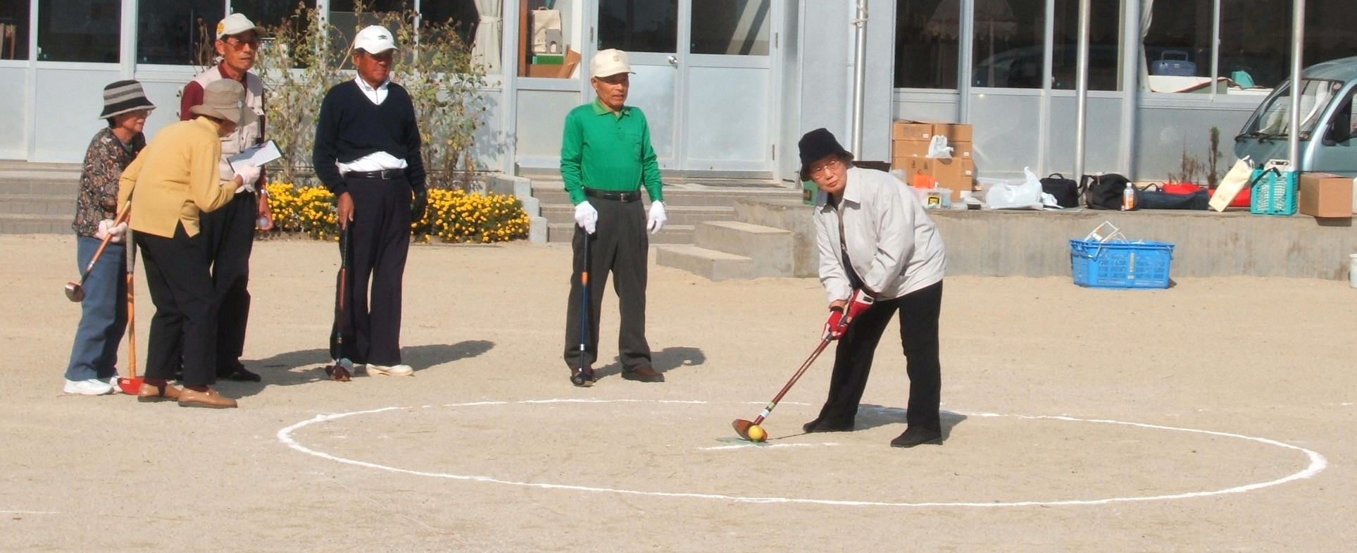 11月というのに夏を感じる様な陽射しの中、第1回の学区グランドゴルフコンペ 13チームの参加を頂き開催致しました。参加条件に制限はありませんでしたが、結果的に高齢者がほとんどの大会となりました。自治会対抗ということもあり 一球一打 真剣ではあるものの さすがの経験豊かな高齢者もボールをあやつるのには四苦八苦!!