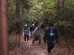 11月14日(日) 体力づくり、健康づくり、そして山の魅力も実感してもらえればと 《三上山ウォーク》を実施しました。御上神社で祈願を済ませ表登山道より、いよいよ432mの山頂めざし お互い見失わない程度の間隔でマイペースでのスタートとなりました。途中 天保義民碑の説明で歴史にも触れ カニ歩きしなければ進めないくらいのミステリアスの割岩にも出逢い、一歩一歩重くなってゆく脚は色づいてゆく周囲の木々にも助けられ、程よい疲労がたまった頃には登頂です。湖南を一望できるパノラマが広がり疲れを癒してくれました。 こころ も からだもリフレッシュでき いい歩こう会になったのでは。(参加者19名)