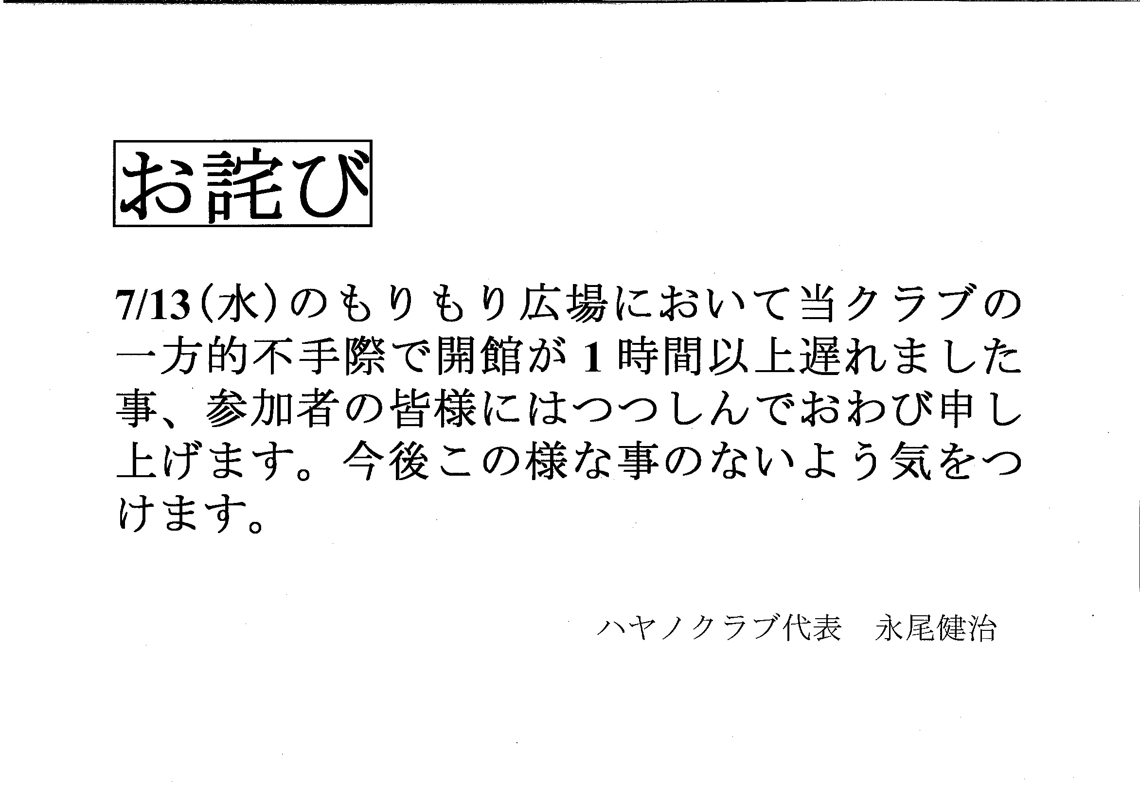 7月13日(水) もりもり参加者のみなさま・・たいへんご迷惑おかけしました。