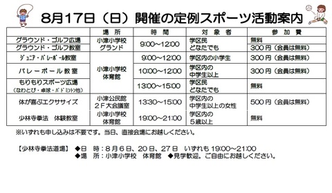 8月17日(日) 8月度定例スポーツ活動のご案内