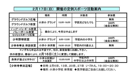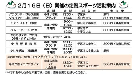 2月16日(日) 2月度 定例スポーツ活動のご案内