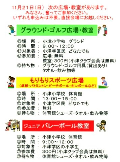 11月21日(日) 開催の広場・教室のご案内
