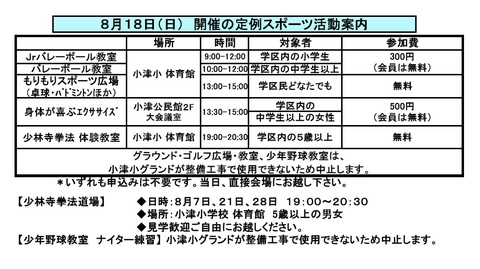 8月18日(日) 8月度 定例スポーツ活動のご案内