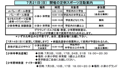 7月21日(日) 7月度定例スポーツ活動のご案内