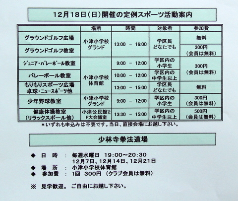 12月18日(日) 12月度 定例スポーツ活動の案内