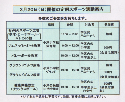 3月20日(日) 3月度 定例スポーツ活動の案内