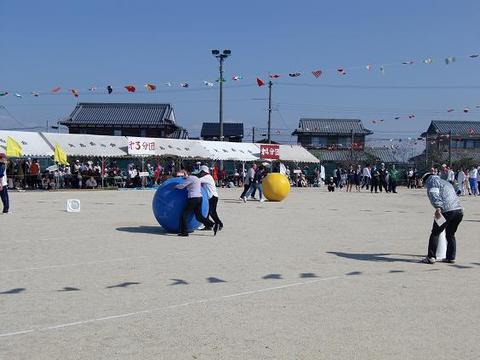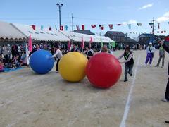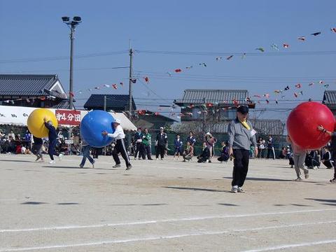 ↓大玉ころがし 玉津運動会の定番です 写真ではゆっくりころがしているように感じますが、とっても高速レースです。大玉についていくのが大変です
