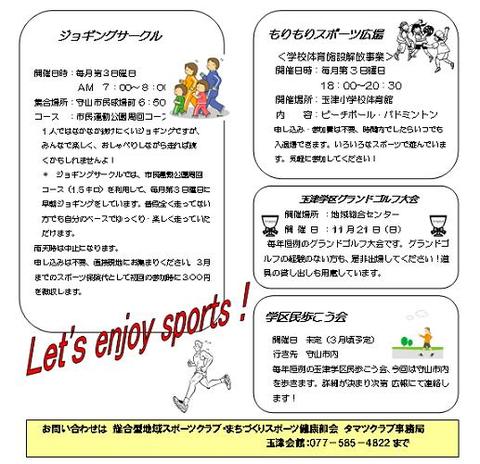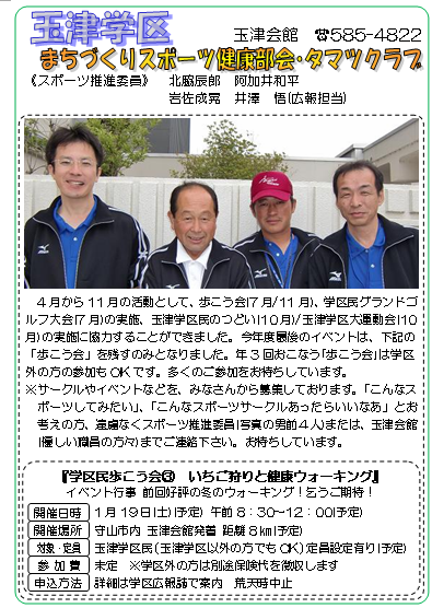 この4名で頑張りますのでよろしくお願いします。ちなみに主な活動は、毎月第3日曜日に玉津小学校でもりもりスポーツ広場を開催しています。こんなスポーツしてみた~い!とかありましたら気軽に声をかけてください。