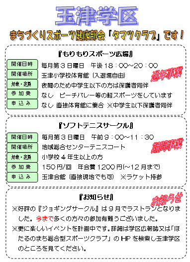 なお、玉津学区では、毎月第3日曜日に玉津小学校体育館とグラウンド(写真)を学区民のみなさまにスポーツを楽しむ場として開放しております。ぜひご利用下さい。