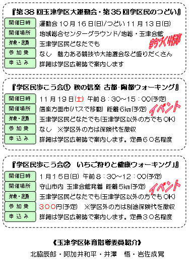 今年は「心かよう明るい玉津」をテーマに第34回玉津学区民大運動会を行います。スポーツの秋です!普段、運動をしてる方もそうでない方も是非ご参加下さい。