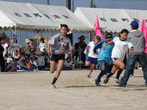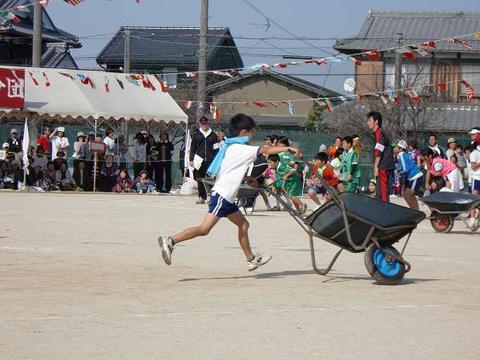 ↓今や人気種目(小学生)のツールドアグリ 交代毎に荷物(水入りペットボトル)を増やしていくんです。雲いきが怪しそうですが、雨の降る気配はまったくなしです