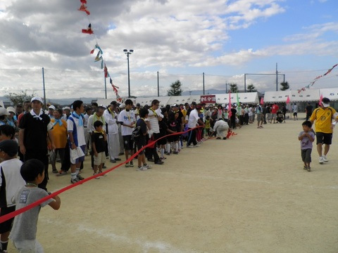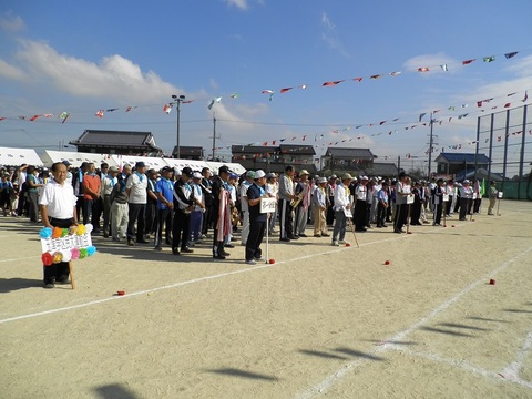 ↓選手入場後の整列。暑い日になりました。10月での気温30℃越えは珍しいそうです。昨日は学区民のつどいもあり連チャンです。みなさんほんとご苦労様です