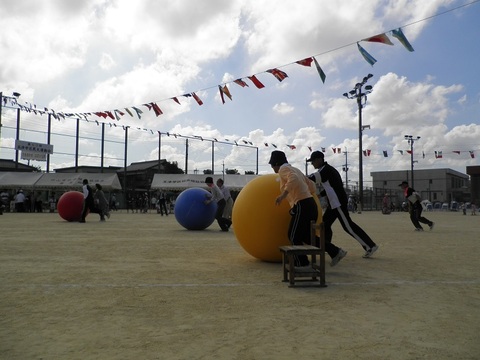 ↓大玉ころがし 玉津運動会の定番です 写真ではゆっくりころがしているように感じますが、とっても高速レースです。大玉についていくのが大変です