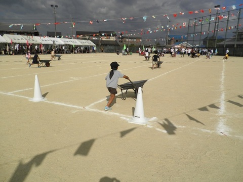 ↓今や人気種目(小学生)のツールドアグリ 交代毎に荷物(水入りペットボトル)を増やしていくんです。雲いきが怪しそうですが、雨の降る気配はまったくなしです