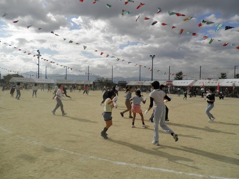 ↓しっぽとりゲーム(女子の部) 分団対抗リレーの代わりの新種目です 分団対抗で自分の分団以外のしっぽをいくつ取るかで勝負を決めます。