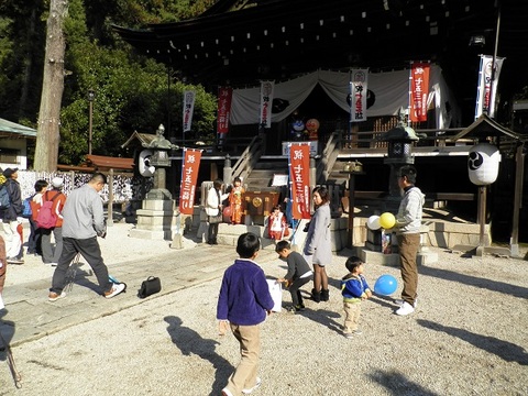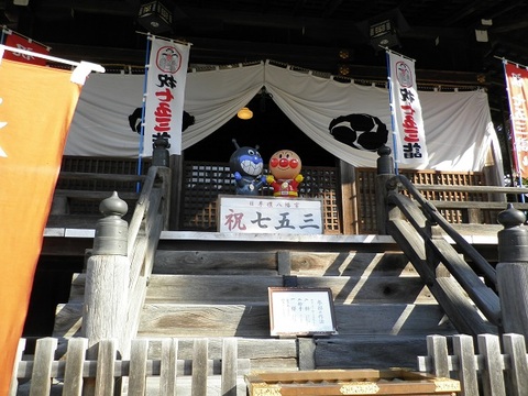 ↓日牟禮八幡宮に到着(9:55ぐらい)。ここで15分程度の自由時間。七五三なのでアンパンマンとバイキンマンが出迎えてくれてました。